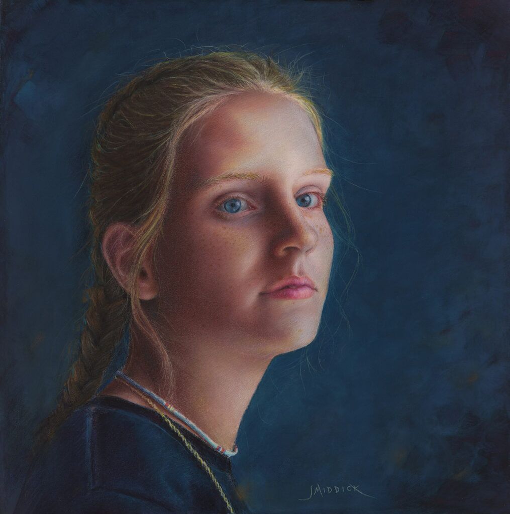 John Middick’s portrait, Danica Dreaming (12 x 12), was created with colored pencil on Pastelmat paper mounted on an Ampersand cradled board. “I use colored pencils for my work due to their ability to easily create details, but also for their lightfast and archival qualities,” the artist says. “I mix solvent with my colored pencil work in the initial layers so that I can move the medium around and build up thick luscious layers of pigment.” Middick chose a surface that would provide extra sturdy support. “On completion, I varnish and it’s ready to hang without a frame,” he says.