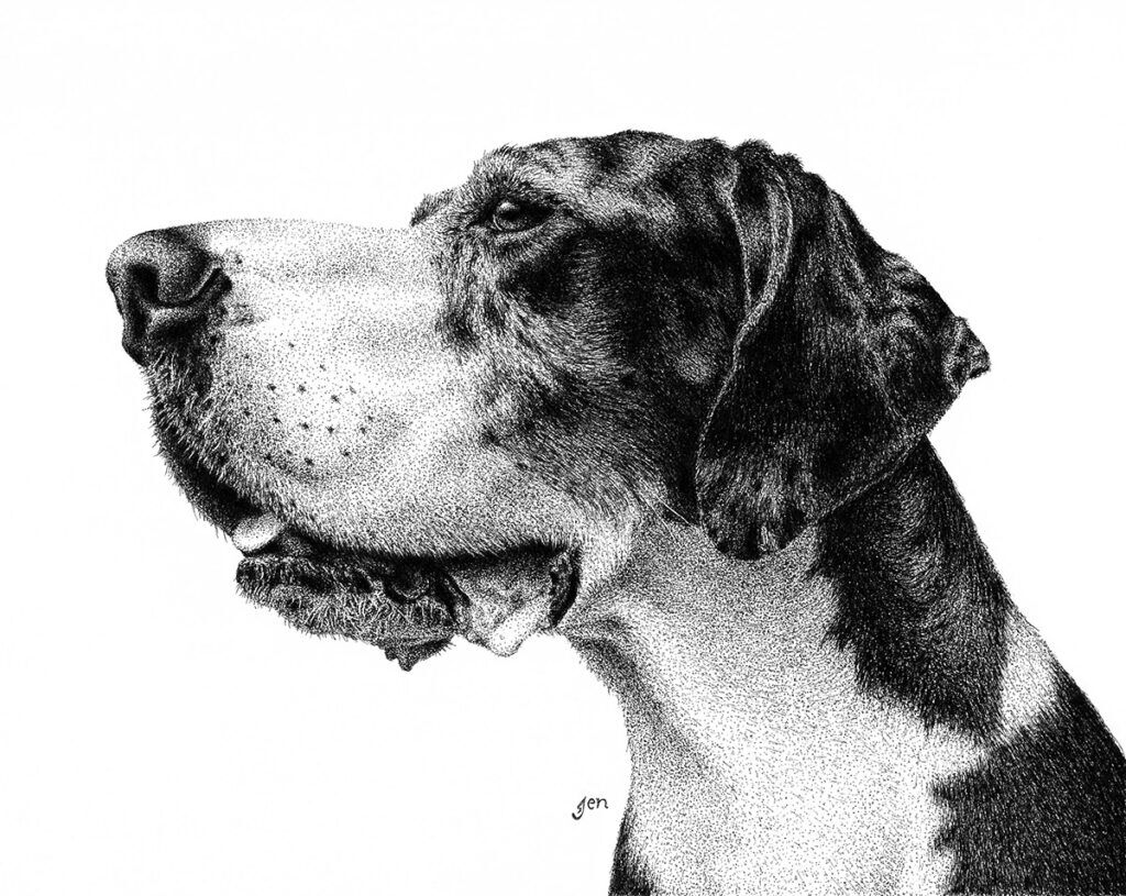 In her drawing Great Dane (pen and ink on paper, 8×10), Jenna Hestekin made the most of contrasting values to create the drama. “I love the drama of stark black and white in my drawings,” Hestekin says, “which allows the depth of values and fine details to represent the unique splendor of the animal. When I saw the magnificence of this stunning Great Dane, I knew I had to draw her. Her amazing harlequin markings were a sheer joy to draw in this medium.” For her pen and ink drawings, the artist uses a method called stippling, building the drawing with a series of minuscule dots. “The pens I use are so fine that they are almost needle-sharp, and this allows for great detail and crisp imagery,” she says. “Stippling is a rhythm, a steady tap-tap-tap that has a calming effect on me as I work. The finishing touches of the drawing come with some line work to suggest the direction of fur and enhance the realism by means of additional texture.”