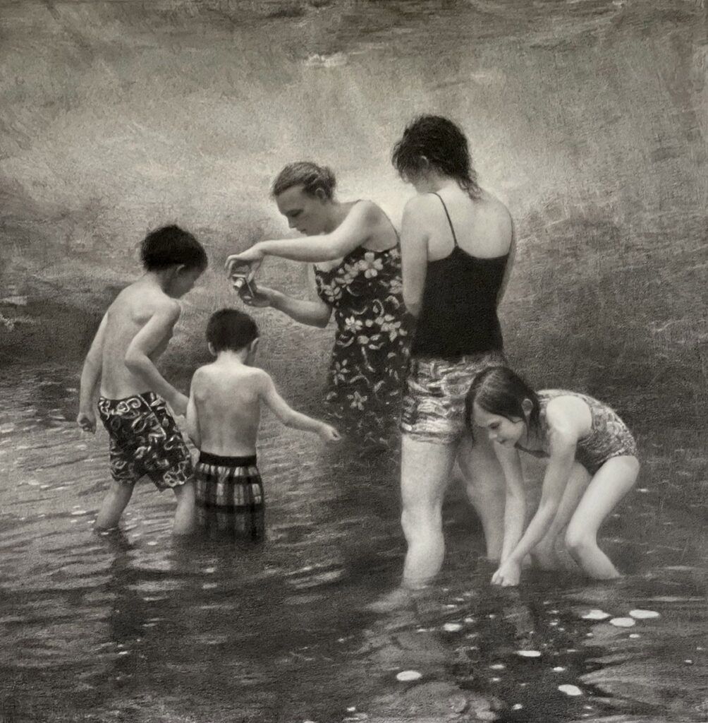 Joseph A. Miller used charcoal for his figural landscape, Flood (20 ½ x 20 ½). To begin the piece, he created an extemporaneous ‘Rorschach Test’ design—an approach he favors for much of his artwork. The artist’s abstract design, something like the famous ink-blot test, served as an inspirational springboard. It also comprised his drawing’s first stage. “Flood was born out of an abstract arrangement of marks, smudges and smears made with paintbrush and powdered charcoal on Arches hot-pressed watercolor paper. I apply the pigment with a soft rag or brush or both,” he says. “Then, I work from my own photo reference to bring the abstraction to a level of realism. I like the combination, and I think the expressive beginning stage imparts a vitality to the finished illusion.”